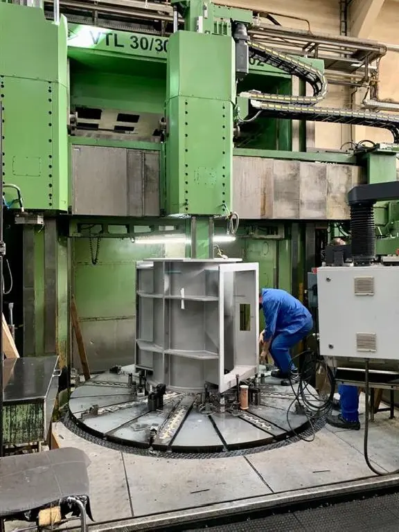 Unter Berücksichtigung der Maschinengröße, der Eigenschaften und der Verfahrwege können die Teile auf dieser Drehmaschine die maximalen Abmessungen von haben: 3300 x 3000 mm und das maximale Gewicht von 30 Tonnen.
