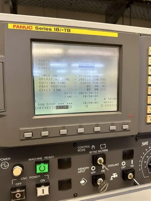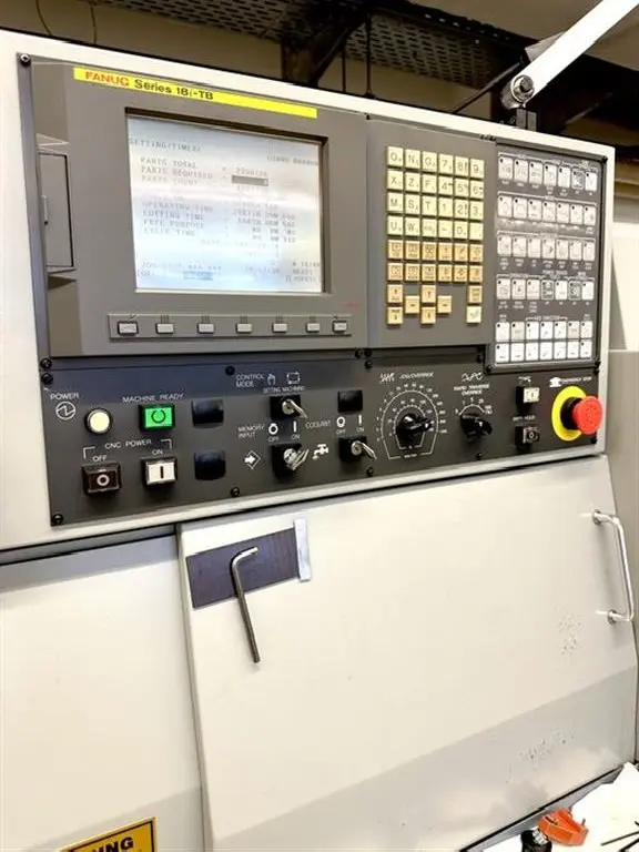 Steuerung: FANUC 18i-TB, bekannt für ihre Zuverlässigkeit und benutzerfreundliche Oberfläche, ermöglicht präzise Einstellungen und Kontrolle über den Bearbeitungsprozess.