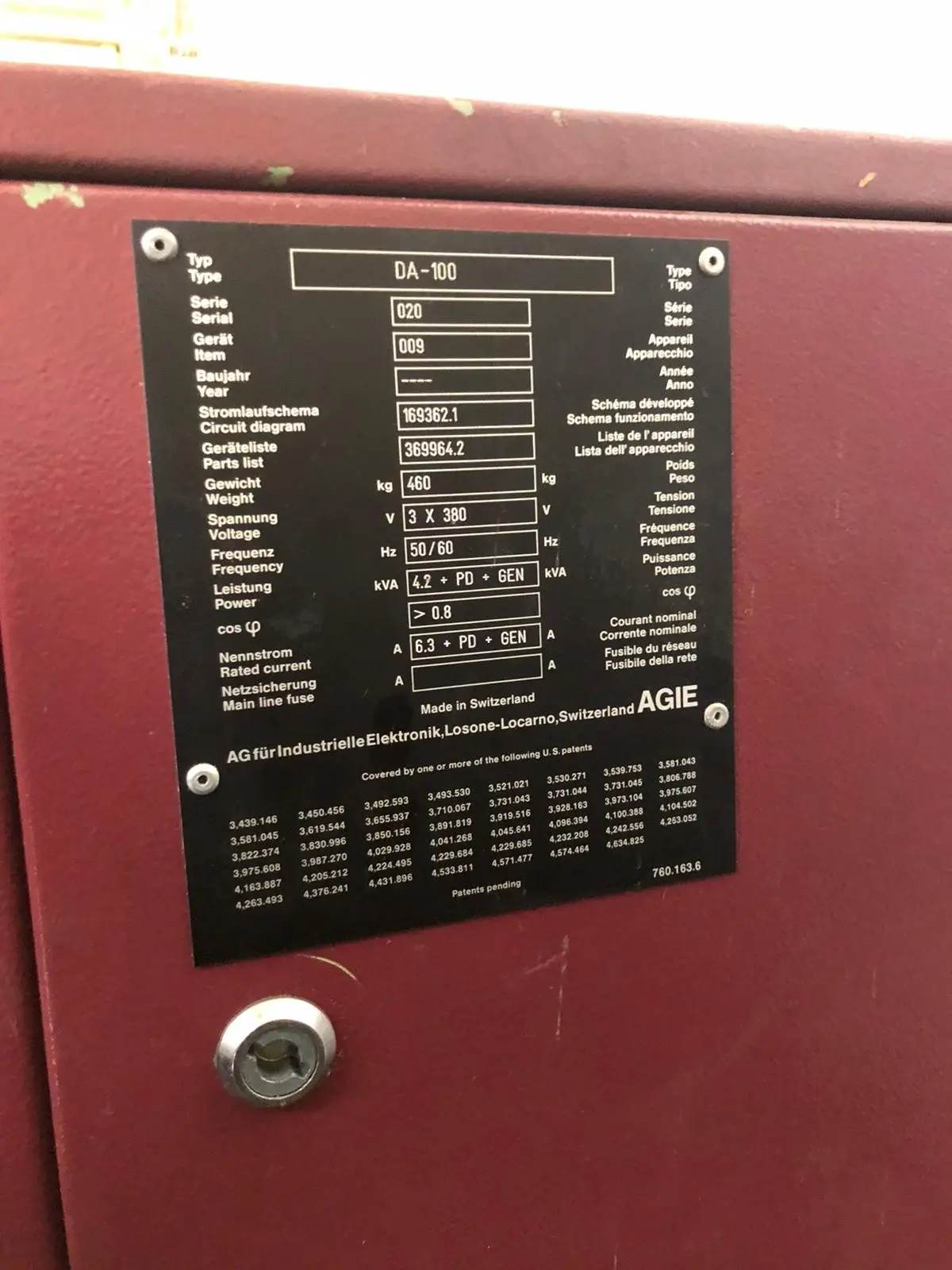 - Generator Agiepuls 60M, Geräteliste 814104.6, Serie 008, Gerät 008, 305 kg 3,4 kVA