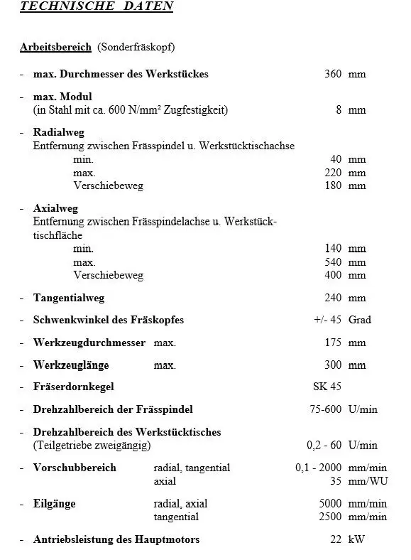 Vertikale Zahnrad-Abwälzfräsmaschine HURTH-MODUL WF 315 S - Technische Daten: