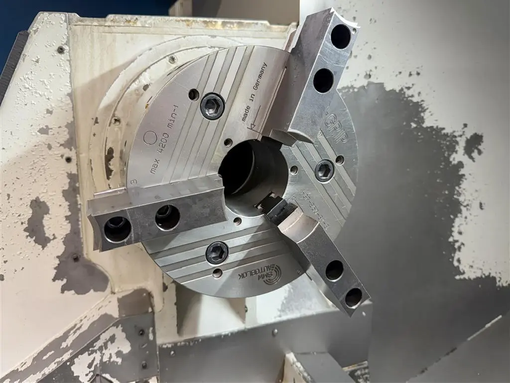 Wenn man die Keilleisten der Z-Achse nachstellt, bis sie mit normaler Vorspannung anliegen, fährt sich die Maschine (ab ca. Z+800) fest. Bei ausreichend gelöster Keilleiste (für kompletten Verfahrbereich der Z-Achse) steigt die Maschine beim Gewindestrelen mit Positionierfehler aus. Kurze Durchmesser können im Bereich am Futter mit mehreren Schneiden in der Steuerung realisiert werden. Durchgehende Durchmesser werden ca. 0,2mm / 100mm konisch gedreht.