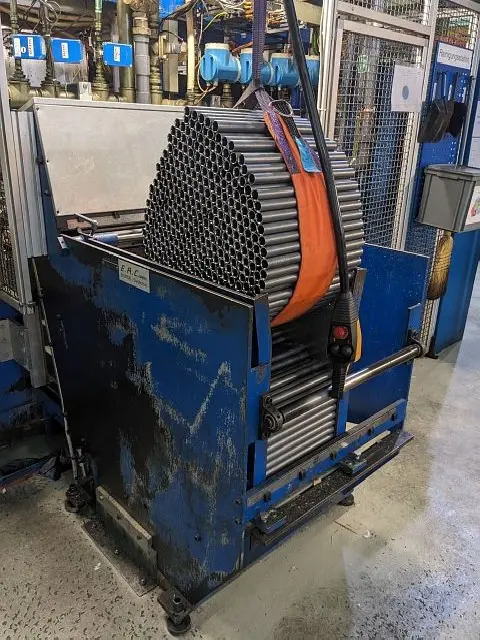 Die Anlage entnimmt die Nockenrohre automatisch aus dem Beladebunker und legt sie