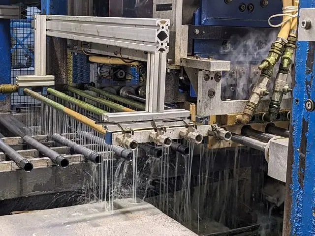 Die Anlage ist ausgelegt, zum Härten, Trocknen und Ölen von Nockenrohren.