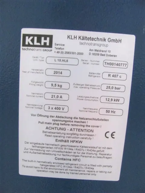KLH L15 HL6 luftgekühlt 10 kW Kälteleistung (18°C/40°C) Pumpe und Tank Baujahr 2014 neuwertigProfessionelle Demontage, Montage und Inbetriebnahme für reibungslose Produktionsprozesse.