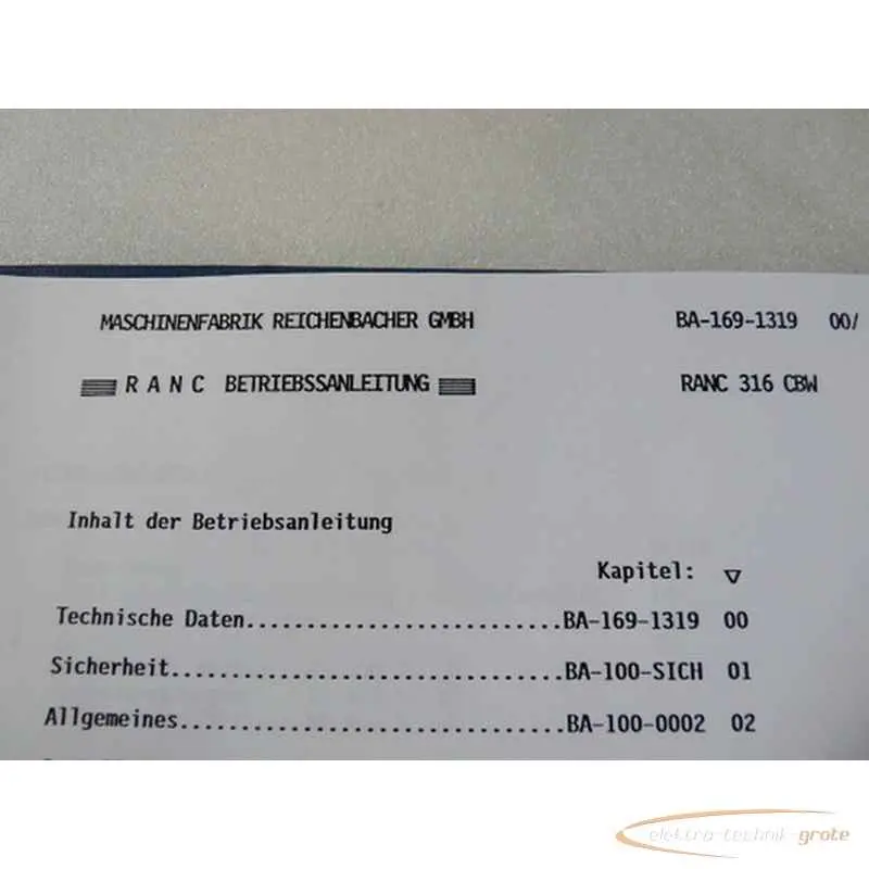 | Modell: | RANC 316 CBKx Masch Nr. 1319 Stromlaufplan Betriebsanleitung Ranc Programmieranleitung Sinumerik 840 D Dokumentation Stand 1996 - 1997 |